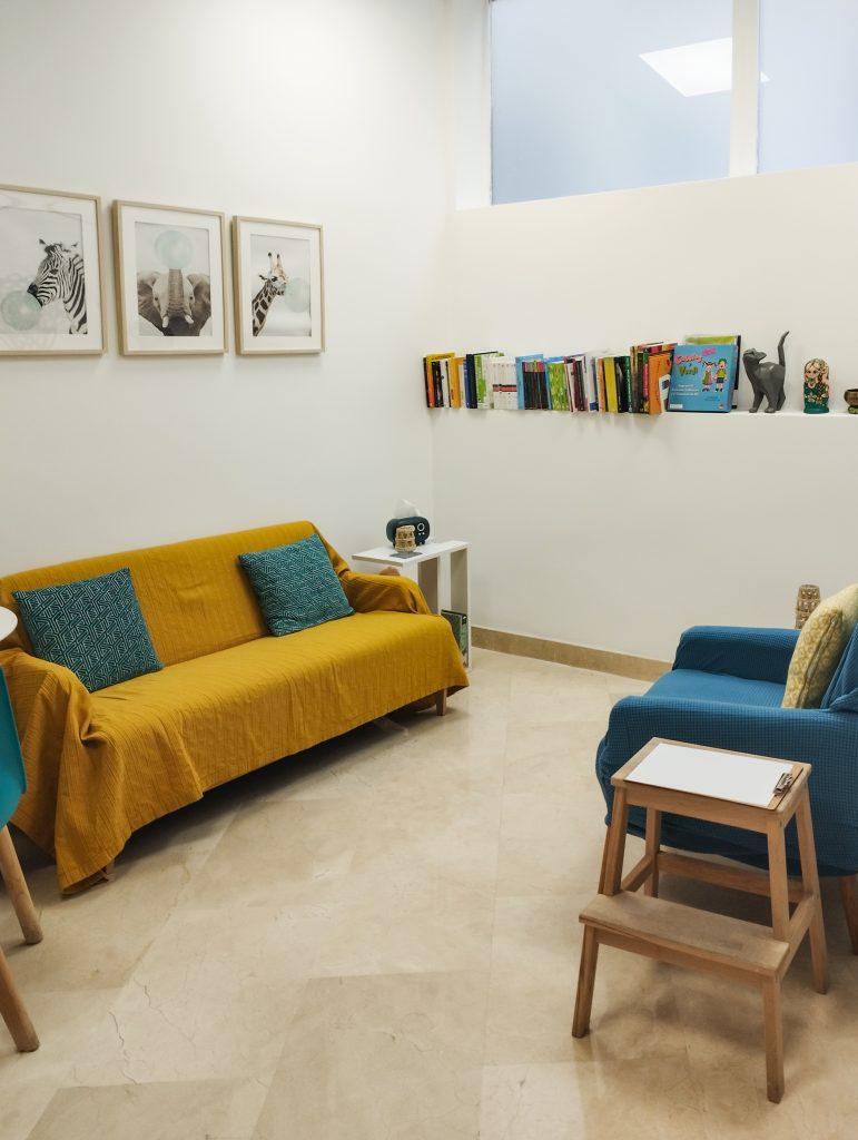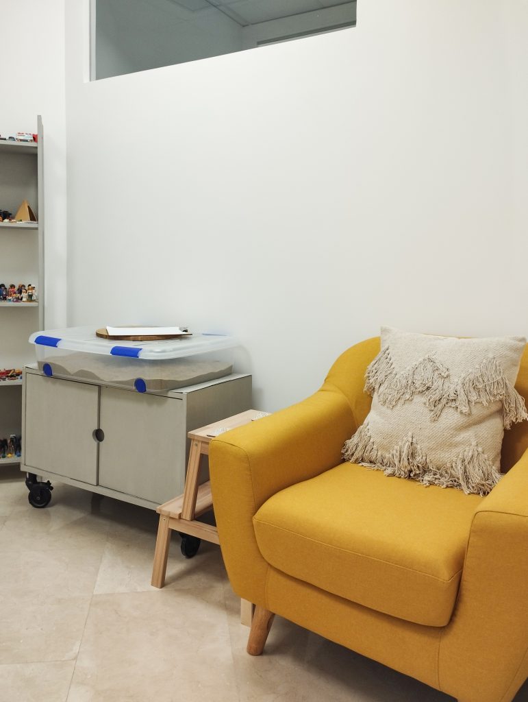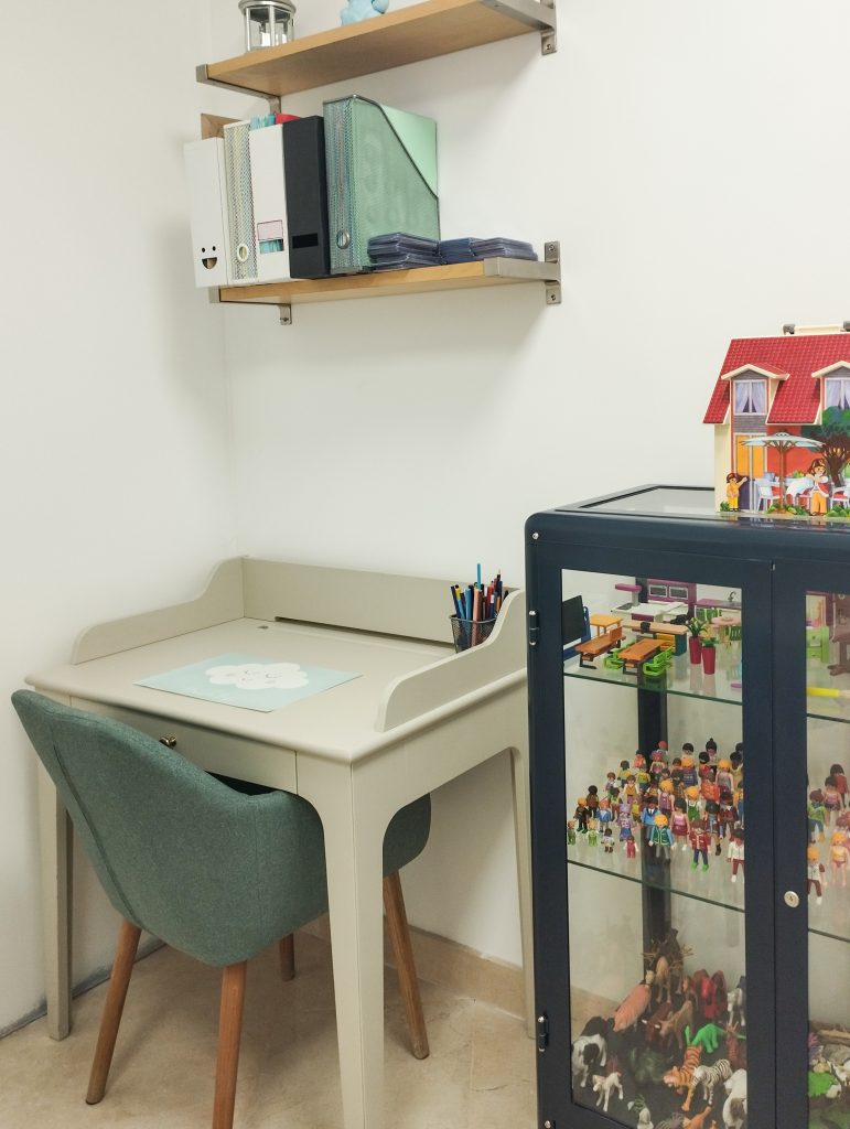 Otro despacho para terapias, con sofá para uno o dos pacientes o comunicaciones, caja de arena, playmobil y escritorio.